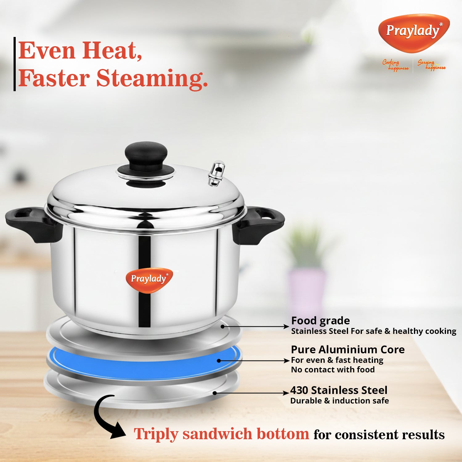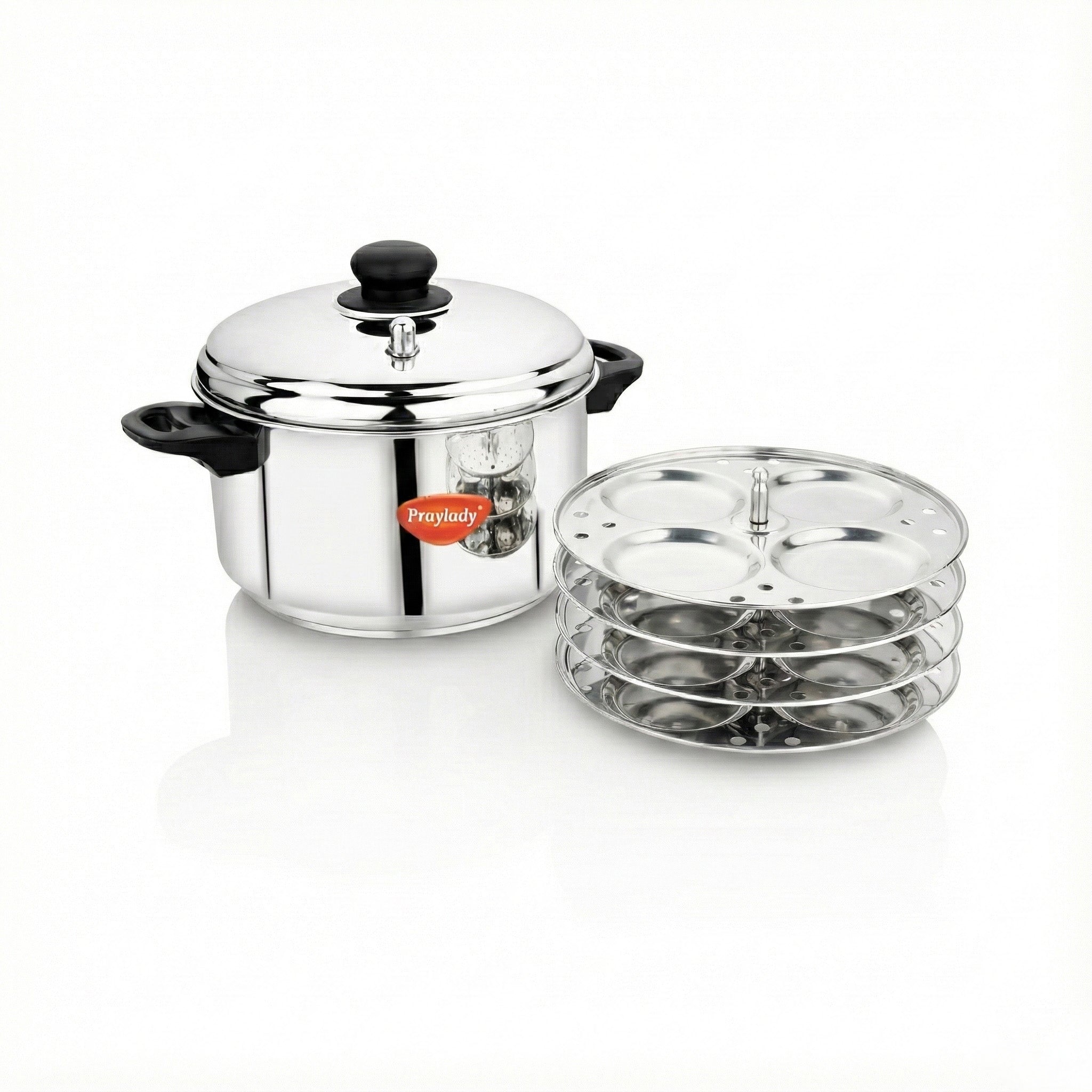 Praylady Elite Stainless Steel Idli Cooker with Sandwich Bottom and Whistle - 4 Plates, Includes Idli Lifter