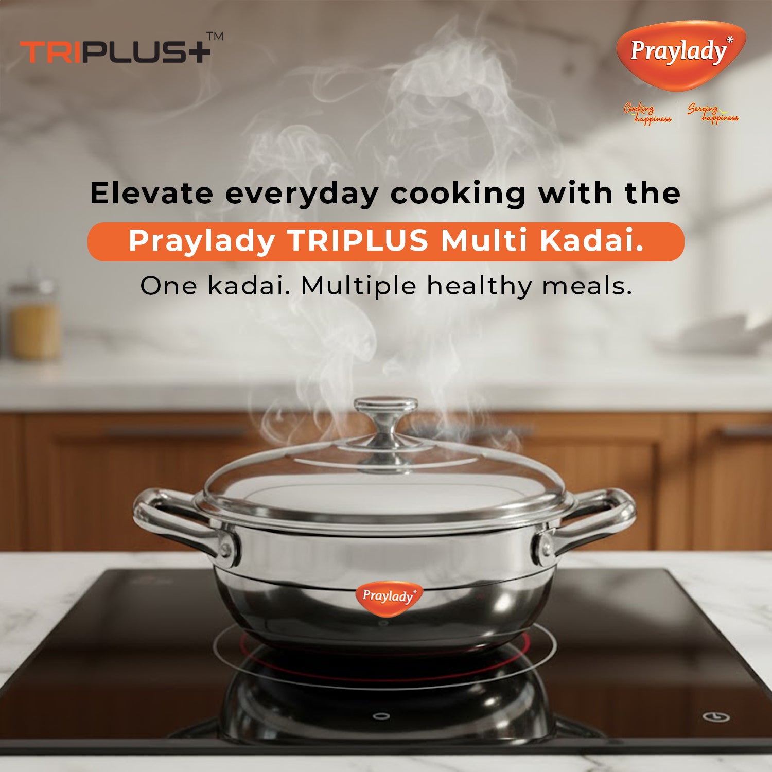 With practicality, durability, and versatility combined in one cookware set, the Praylady Triplus Pro+ Triply Mini Multi Kadai makes everyday cooking easier while naturally bringing the joy of Cooking Happiness, Serving Happiness to your kitchen.