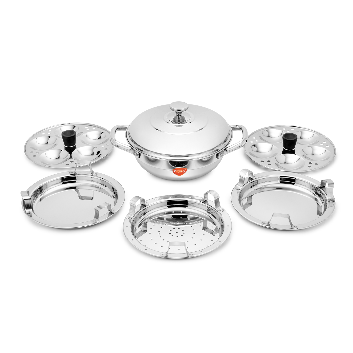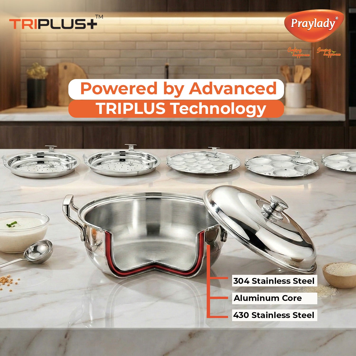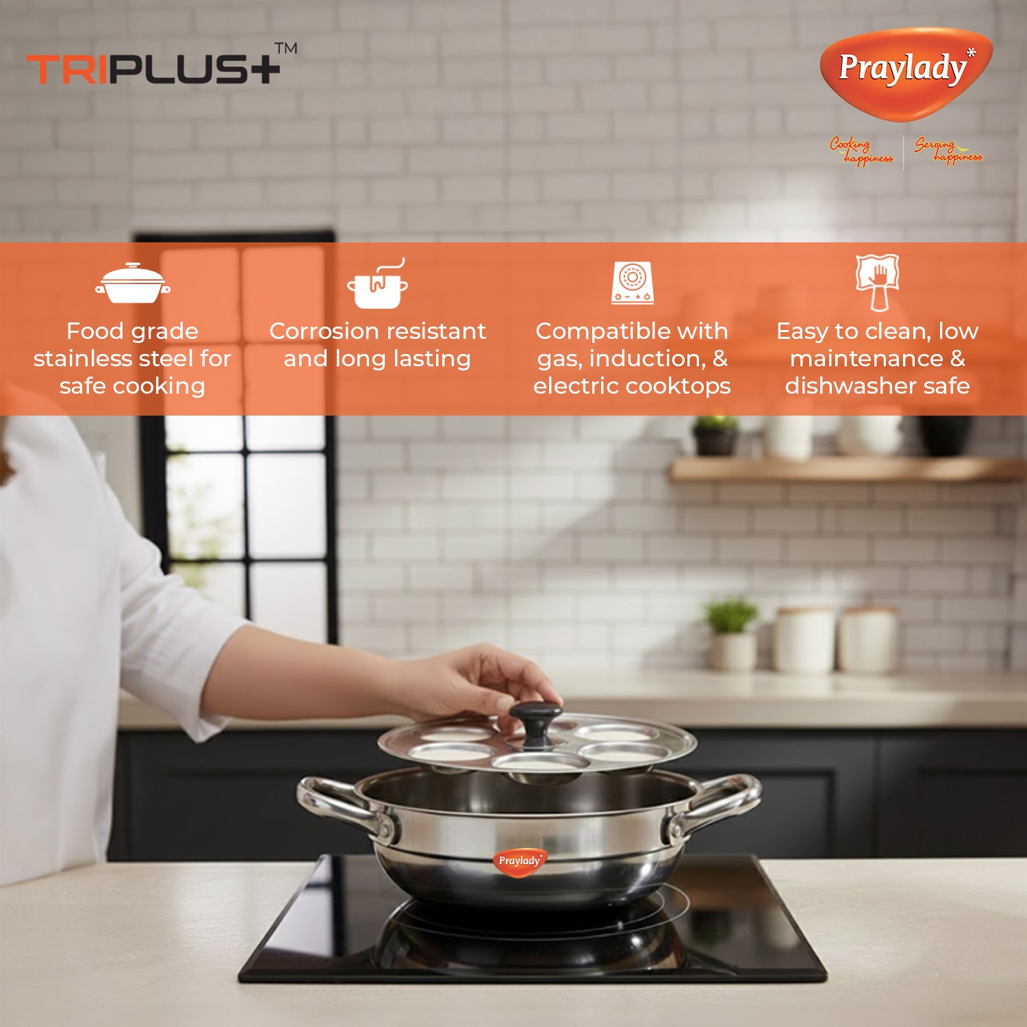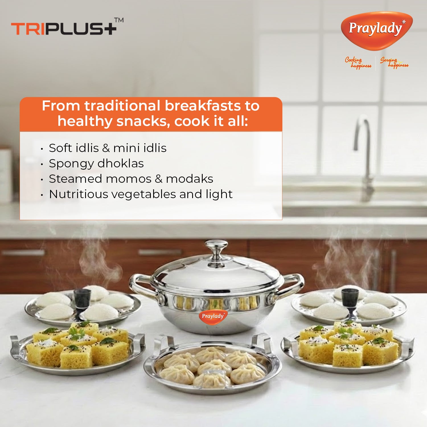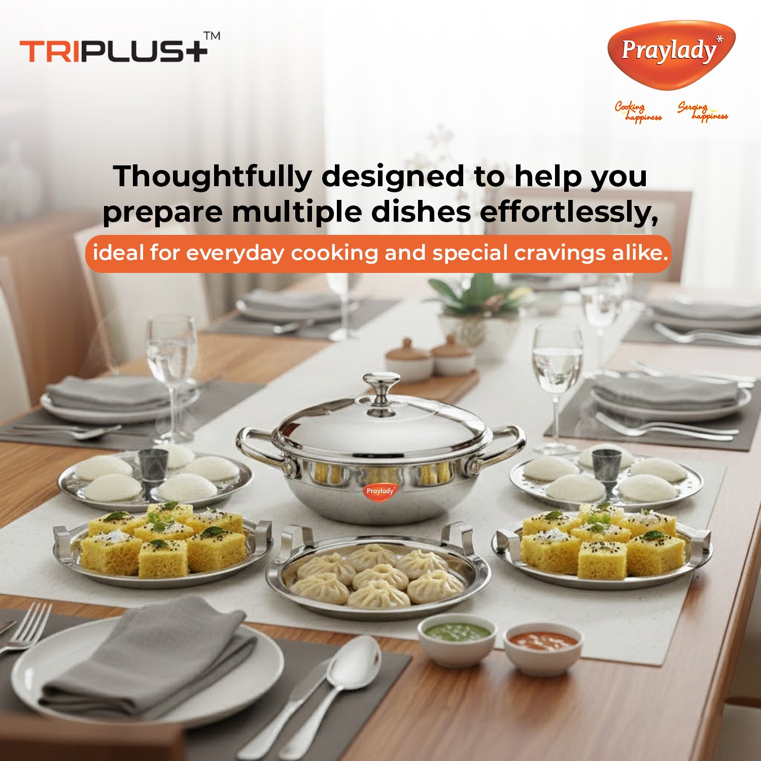 β¨ Advanced TRIPLUS+ PRO Technology : The Praylady Triplus Pro+ Triply Mini Multi Kadai is crafted for efficient and even heat distribution, helping idlis, dhokla, momo, modak, and steamed dishes cook evenly with soft texture and delicious results.