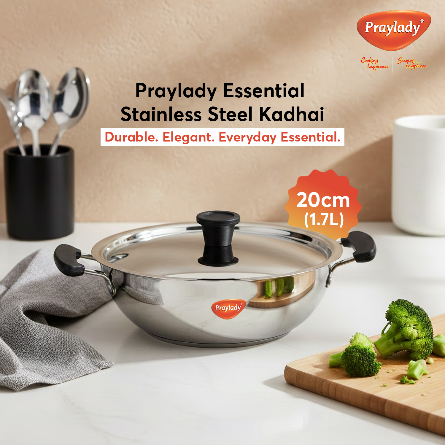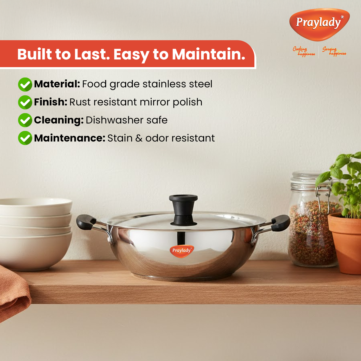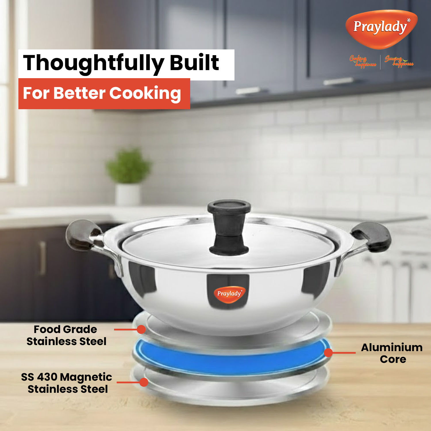 Essential Stainless Steel Kadhai | Sandwich Bottom, Stay-Cool Handles & Lid | Induction & Gas Compatible