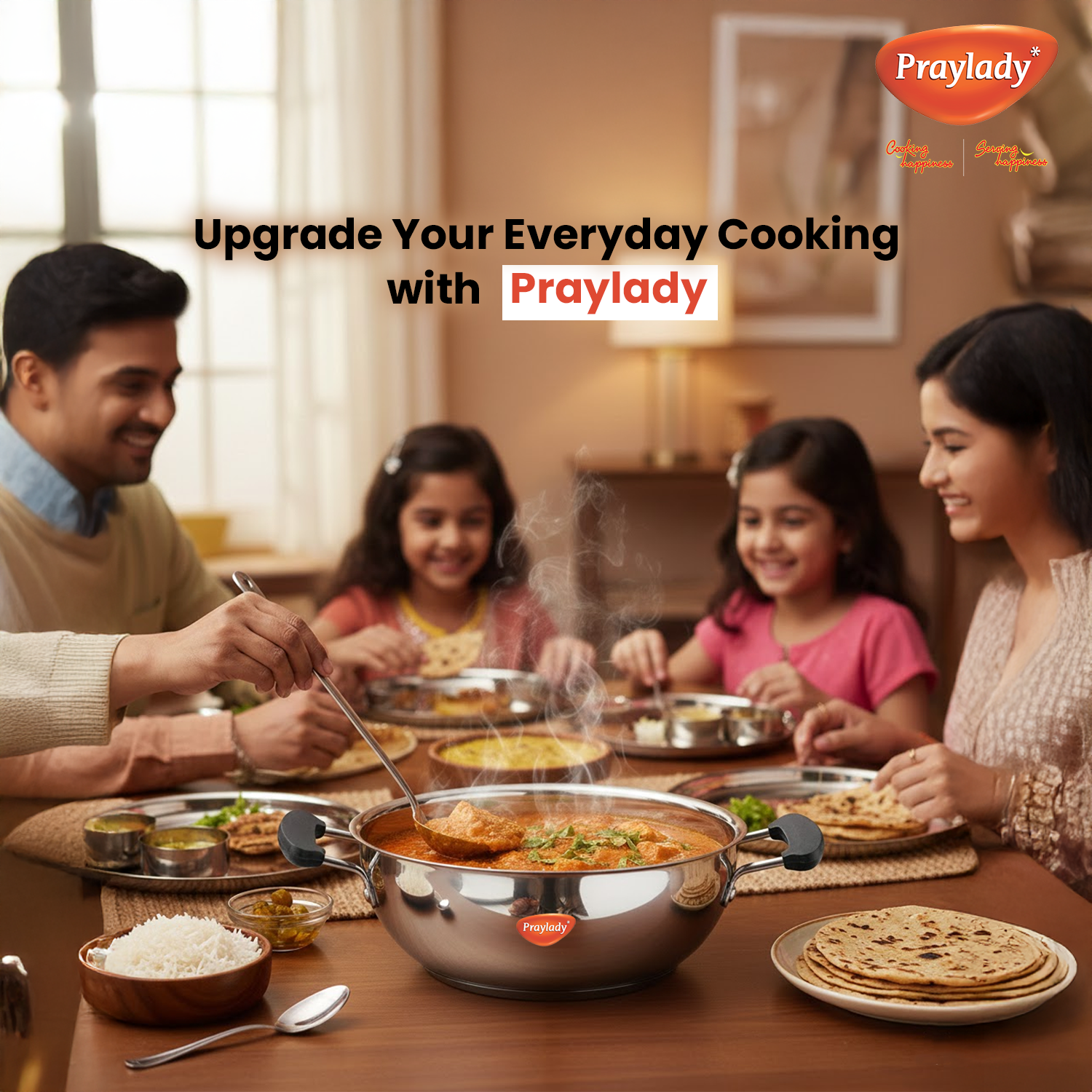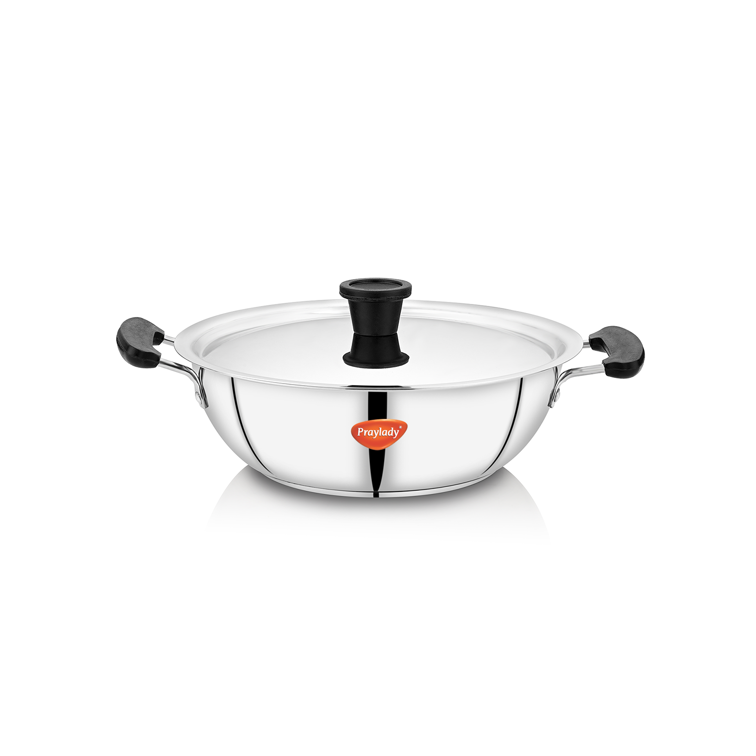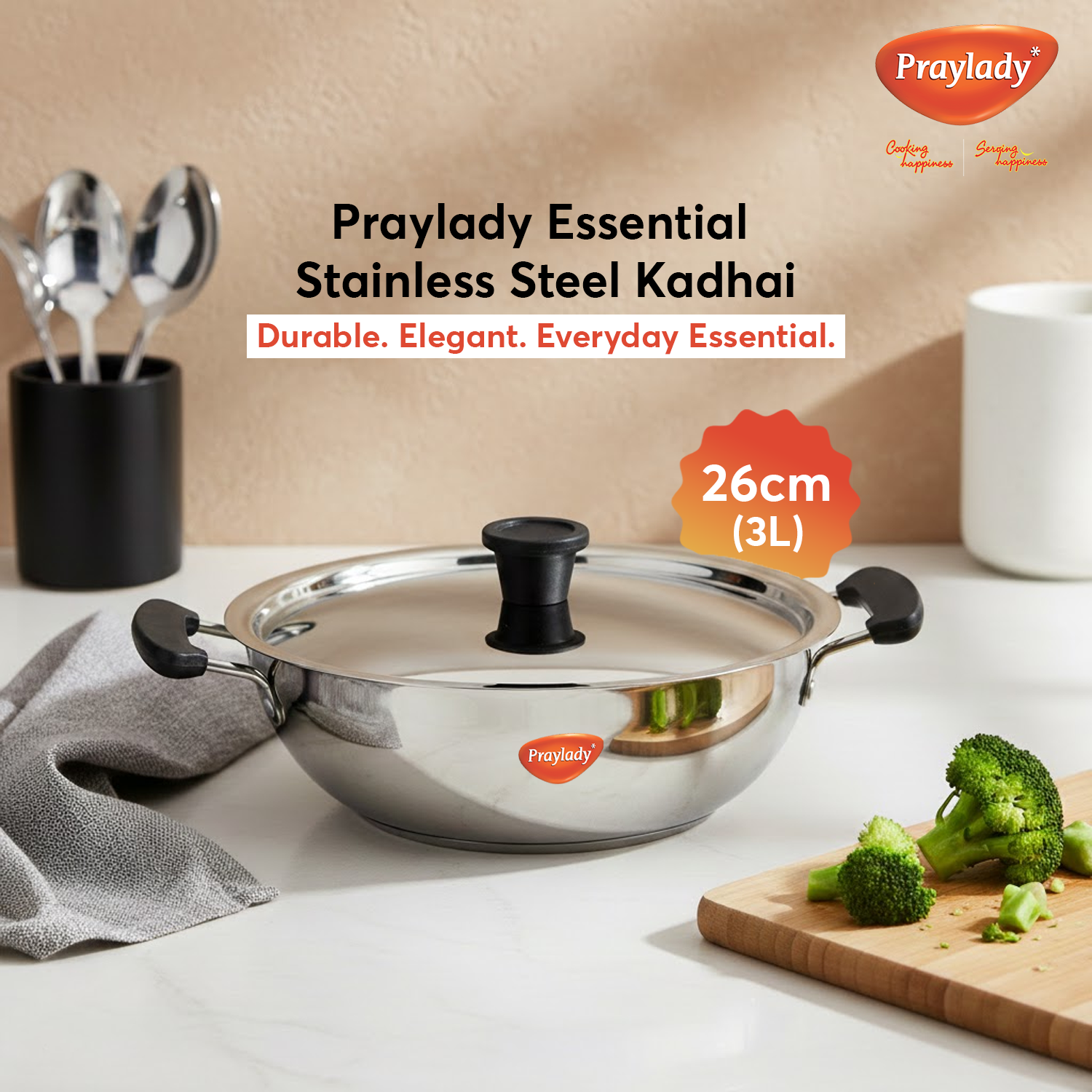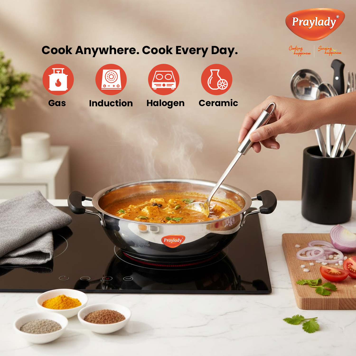 Essential Stainless Steel Kadhai | Sandwich Bottom, Stay-Cool Handles & Lid | Induction & Gas Compatible