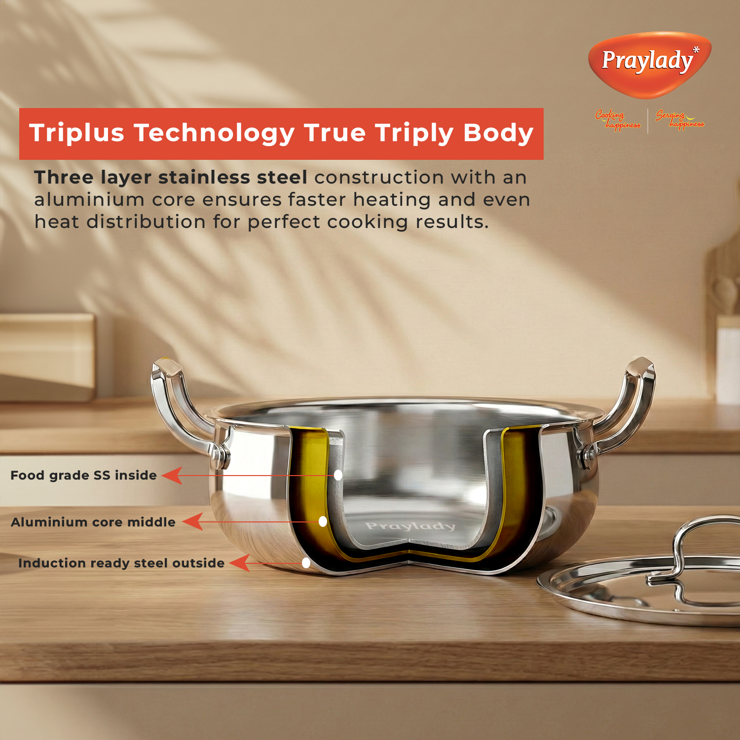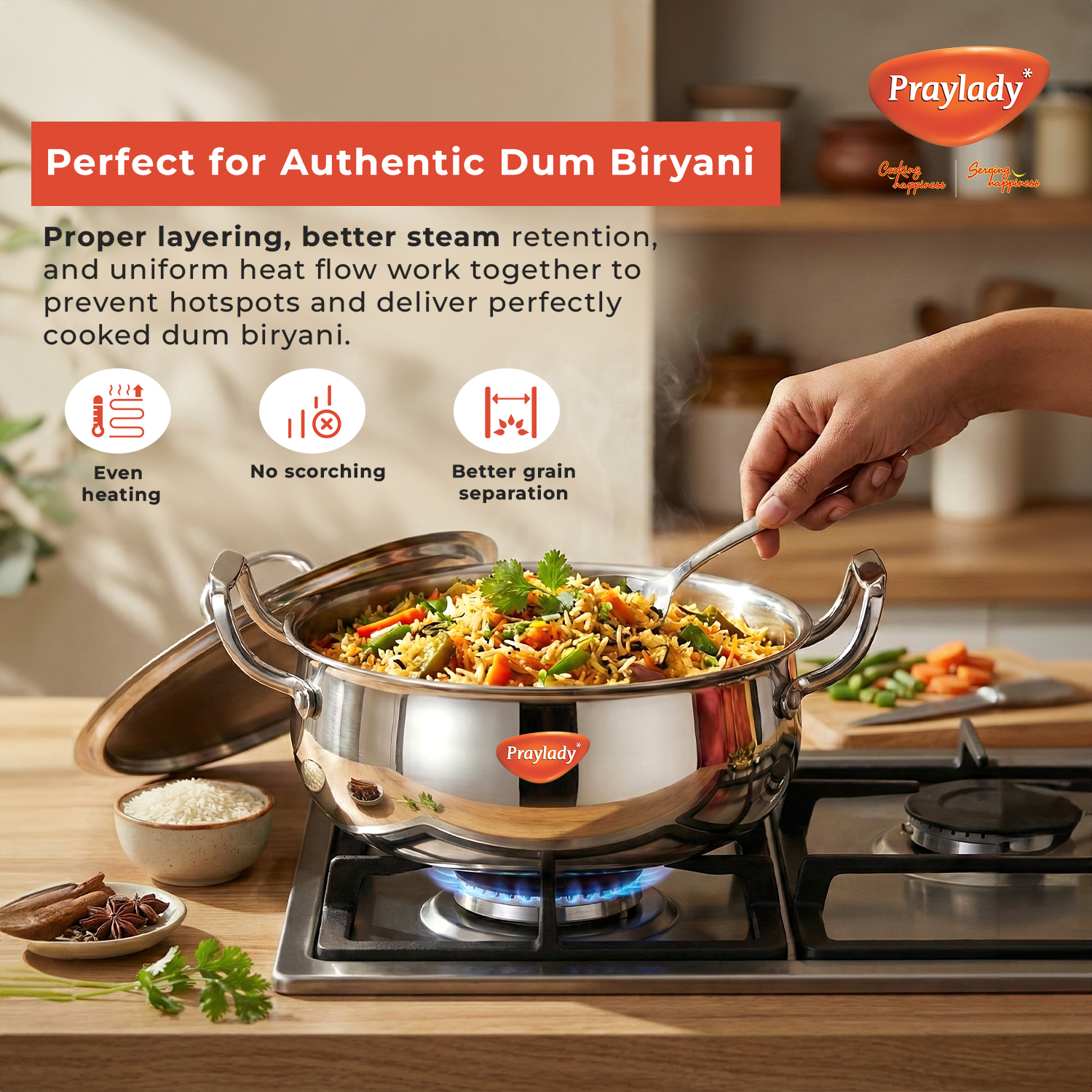 Praylady Triplus+ Pro Triply Biryani Handi | 24 cm | 4.0 L | Dum Biryani Cooking Pot | Patila