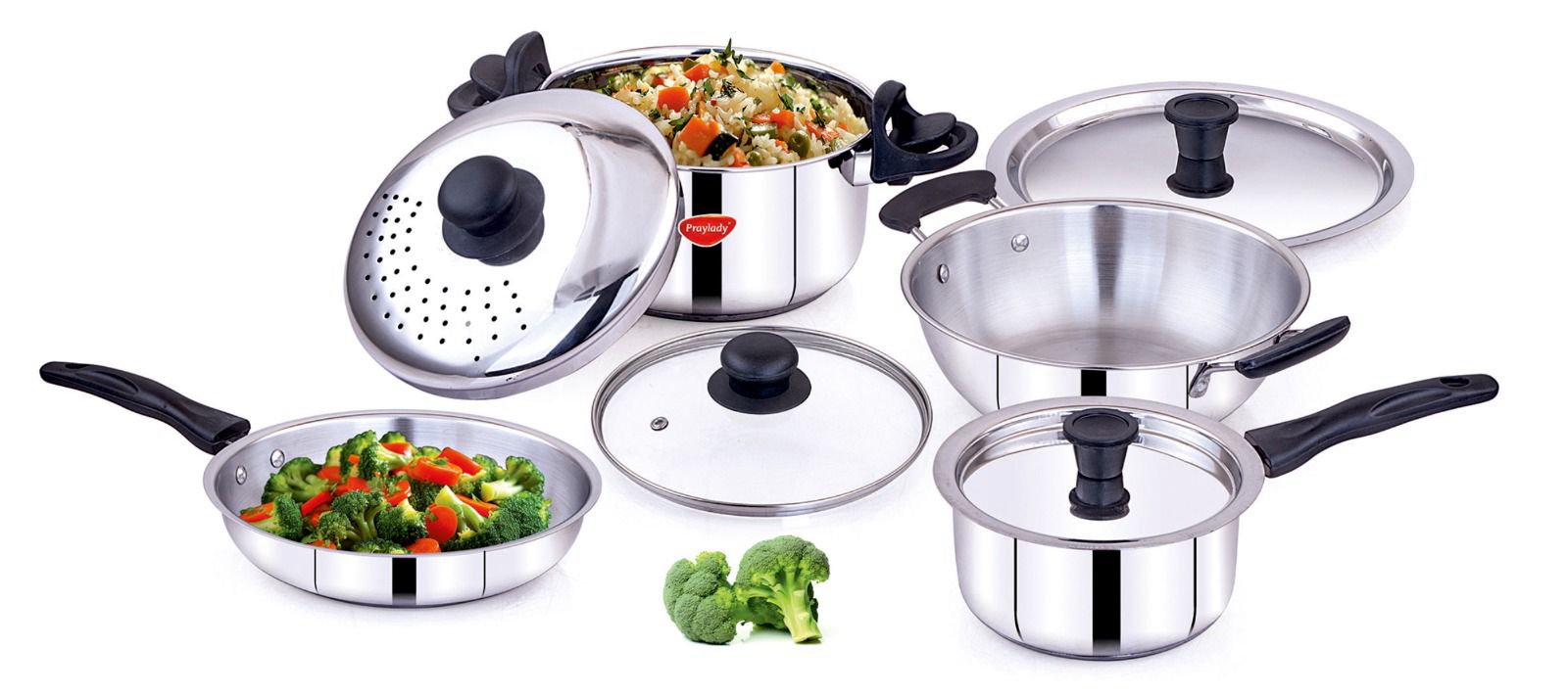 Praylady Ultimate 8-Piece Stainless Steel Cookware Set | Tri-Ply Base for Fast Cooking | 3L Strainer Pot with Glass Lid | 22cm Kadai with Lid | 22cm Fry Pan | 16cm Saucepan | Induction & Gas Friendly