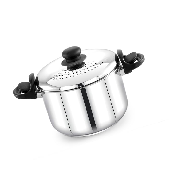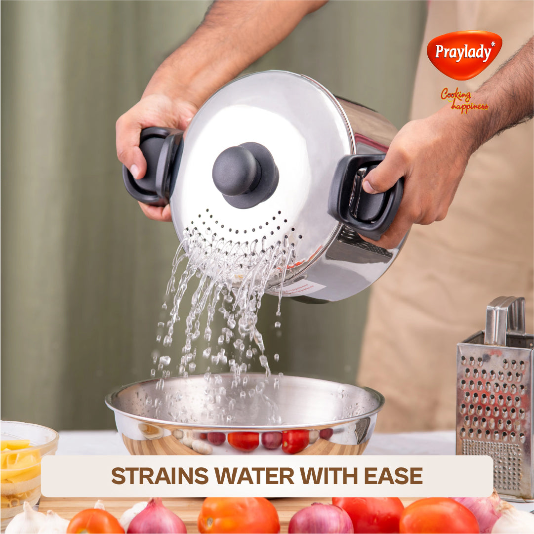The fully stainless steel construction resists rust, stains, and scratches while retaining natural flavors. An integrated strainer lid lets you drain pasta, rice, noodles, or vegetables directly from the pot, no colanders, no extra mess. The steel lid design maintains durability under high heat and is paired with an anti-locking mechanism for safe, jam-free lid removal.